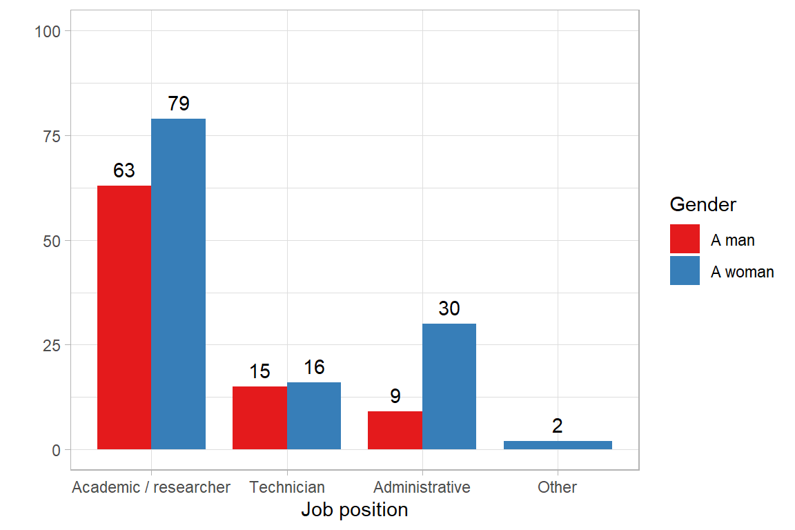 One would expect that women are overrepresented among administrative personnel while the gender represenattion should be more equal at the academic level (depending on age) and for technicians. In the following code, we also remove all NAs from both the gender as well as job position variable: