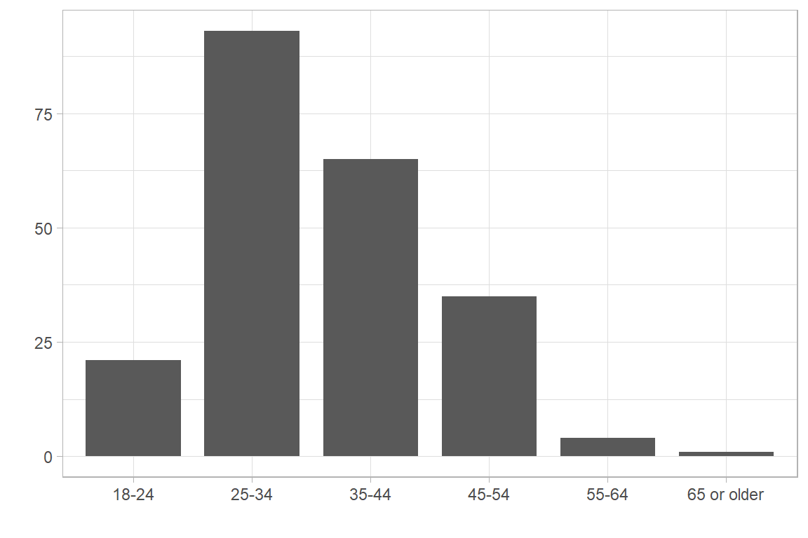 df.geam02$age <- curyear - df.geam02$SDEM001Listing 2.5 assigns respondents to a specified age group using the newly created age variable with the cut() command. We create four groups.