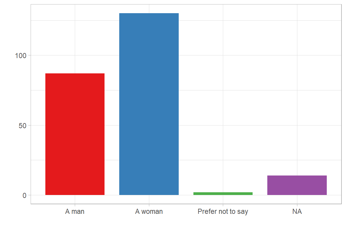 Responses regarding gender (‘SEM004’) are then easily summarised with a frequency table or bar chart that demonstrates that answer option ‘[2] Non-binary’ or ‘[4] Prefer not to say’ or ’[5] Prefer to self-identify as:” are comparatively few.