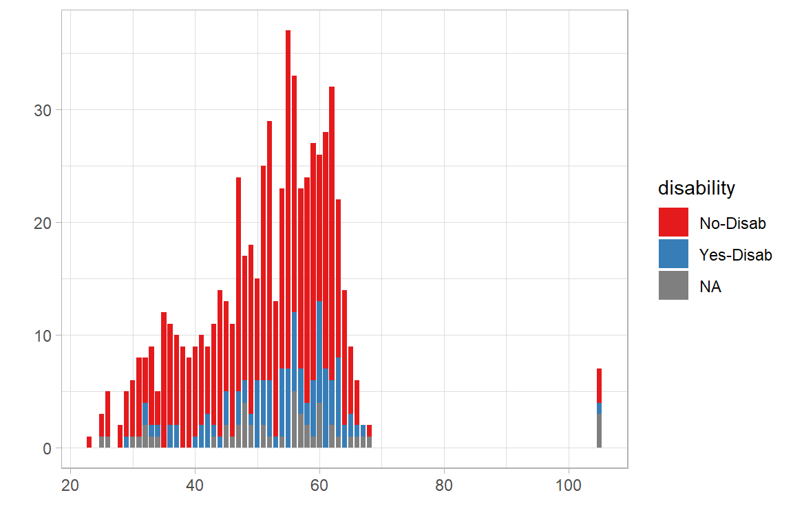 # construct three color palettecpal <- RColorBrewer::brewer.pal(3, "Set1")# create barchartdf.geam |>filter(!is.na(age)) |>ggplot(aes(x=age, fill=disability)) +geom_bar(width=0.8) +scale_fill_manual(values=cpal) +labs(x="", y="") +theme_light()