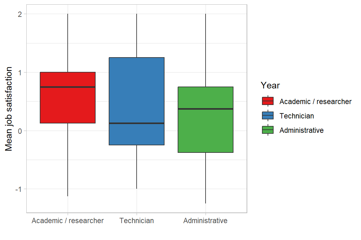 labs(x="", y="Mean job satisfaction", fill="Year")