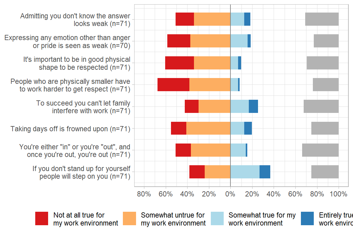 Each dimension is captured with two sub-question as shown below. Although an organizational level measurement scale, outcomes at the organisational level are expected to trickle down to the individual level, for example in terms of turn-over intentions, burnout, job-satisfaction, or overall individual well-being of employees. As Glick and co-authors write, “[…] both men and women experienced masculinity contest workplaces as dysfunctional, rife with negative social behaviors, dissatisfying, and personallyl harmful.” (Glick, Berdahl, and Alonso 2018).