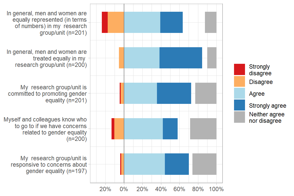 While the general perception is that women and men are treated equally within the organisation (item SQ002) and that gender equality issues are taken seriously within research groups and units (item SQ002 and SQ005), two items receveid a relatively stronger disagreement rating. This concerns the equal representation of women and men in research units (SQ001) as well as the general knowledge of whom to approach with GE concerns (SQ004).