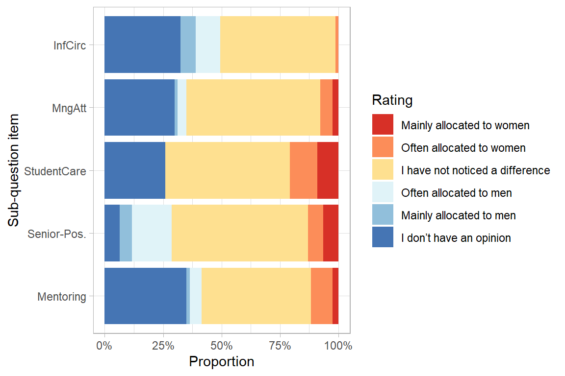Overall, responses points to a rather gender fair working environment, as disagreement on disproportionate constraints and disproportionate constraints is rather high. Interesting, this holds less for the Hostility - Queen bee syndrom which is reverse coded. Here respondents also strongly disagree that high-level women help other women succeed in the organisation.