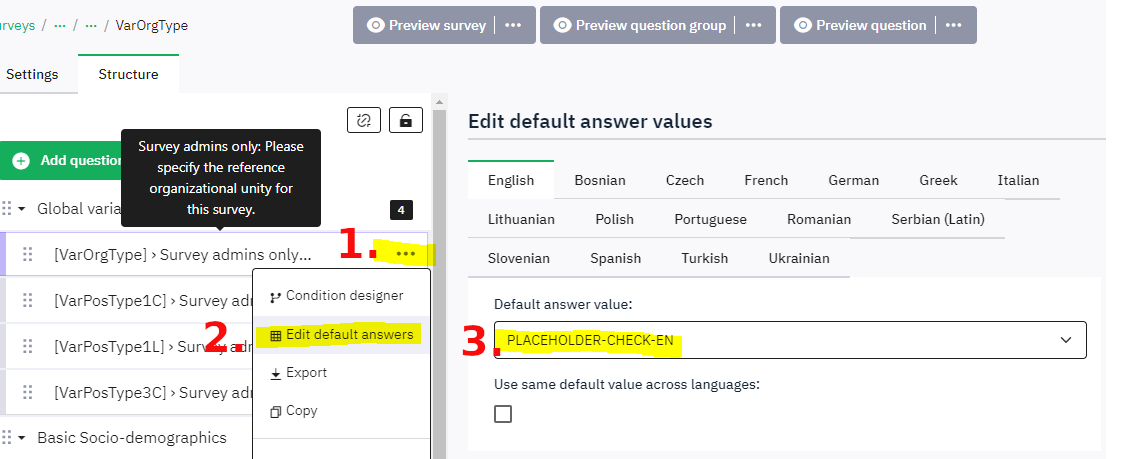 In order to contextualize the survey to a given organizational unit, switch to questionnaire “Structure” and open the first question group, called “Global Variable Definitions”.
