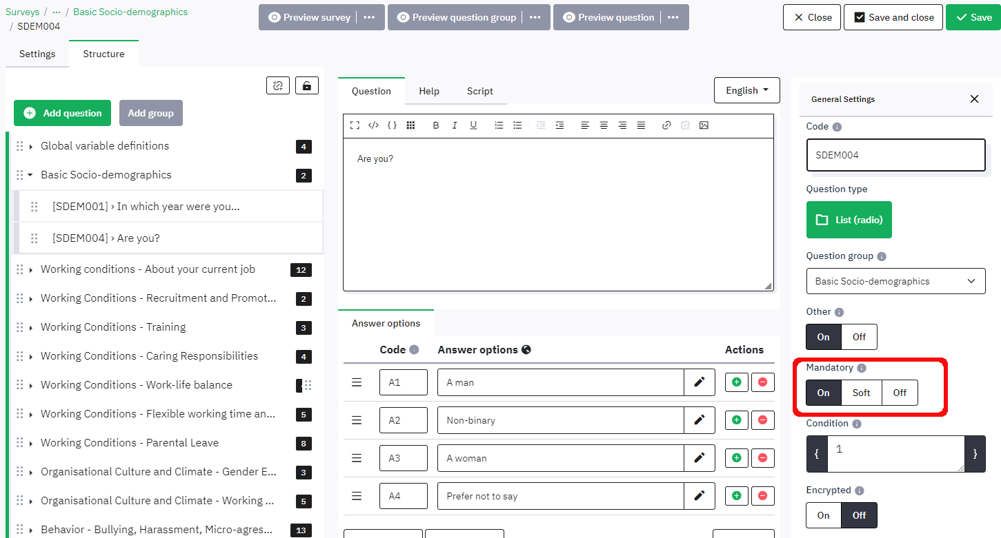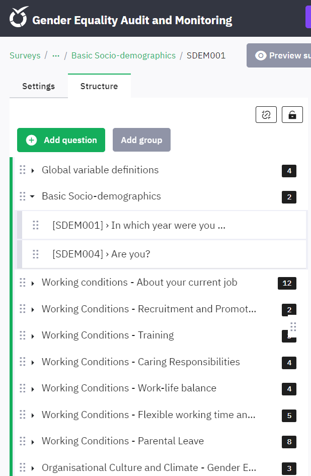 Under the “Structure” tab see 4.1 (b), the content of the questionnaire can be edited, i.e. the questions and response items. The Structure tab displays the question groups, indicating the number of questions within each. For example, the “Working conditions” includes 12 questions, the “Basic Socio-demographics” question group includes two questions. Clicking on a specific question makes it editable in the main screen of the browser.