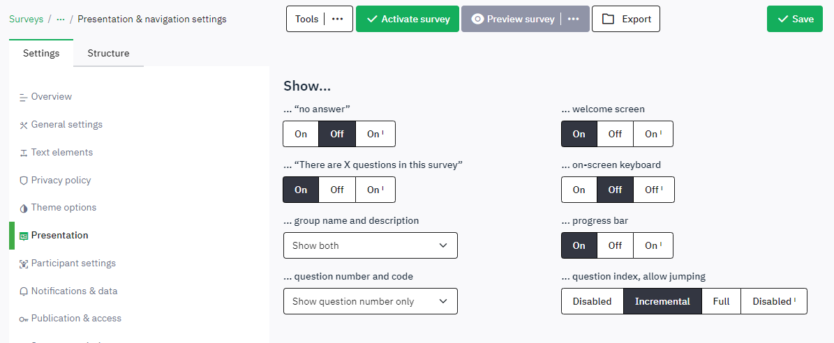 Show progress bar: “On”. Informs respondents about the progress made, i.e. how many questions are left.
