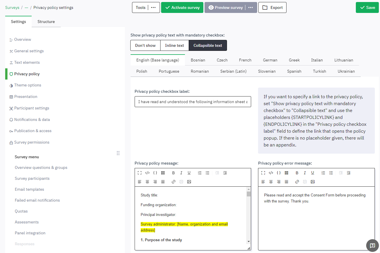 Be sure to adapt the data policy settings for all available languages of your survey!