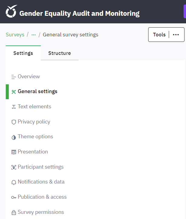 Under the “Settings” tab see 4.1 (a), the global adjustments to the survey need to be made, including the welcome and end message, available languages, privacy settings or launch and end dates among others.