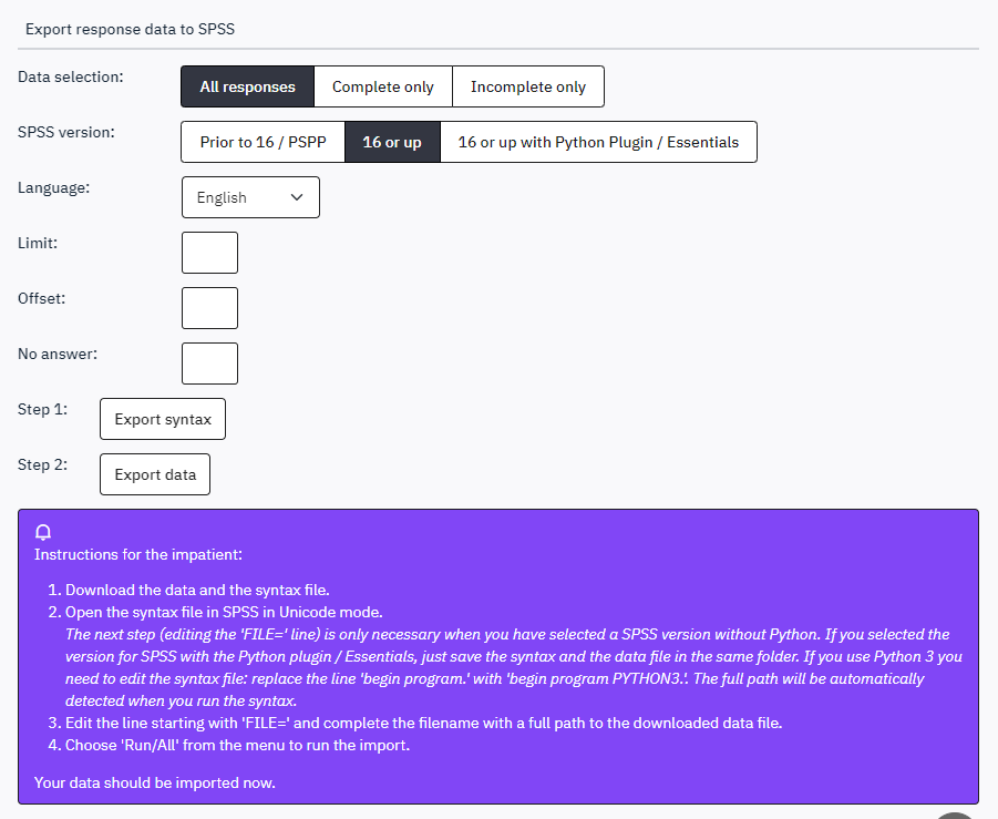Exporting to SPSS involves two steps: exporting the data and the syntax file as also indicated in the screenshot for SPSS export: